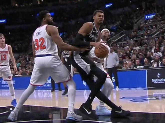 與尼克斯比賽的第四節,文班亞馬在一次籃板球爭奪落地時疑似左膝過度伸展,隨後他的表情十分痛苦,一瘸一拐返回更衣室。