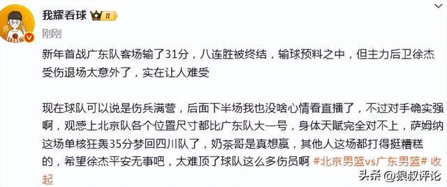 博主“我耀說球”發文點評:新年首戰廣東隊客場輸了31分,八連勝被終結,輸球預料之中,但主力後衛徐傑受傷退場太意外了,實在讓人難受。