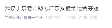 於東老師是國家級運動健將,身高1.93米,畢業於華南理工大學行政管理係,擁有極為豐富的頂尖賽事經曆:2012-2013賽季、2013-2014賽季,她代表山西隊兩奪WCBA(中國女子籃球聯賽)冠軍;2017年9月,代表廣東隊斬獲第十三屆全運會女籃冠軍,憑借出色表現榮記大功,並被授予“廣東省三八紅旗手”榮譽稱號;2025年4月,代表廣東隊奪得WCBA冠軍。此外,她還曾先後入選國少、國青、國奧集訓隊,2018年更是進入國家隊備戰亞運會,在U16、U18女籃亞洲青年錦標賽中均助力球隊奪冠,競技實力與大賽經驗備受認可。2025年7月,於東老師入職佛山一中,後因備戰第十五屆全國女子籃球成年組比賽,被廣東省二沙體育訓練中心借調為重點運動員,全力投入賽前訓練。