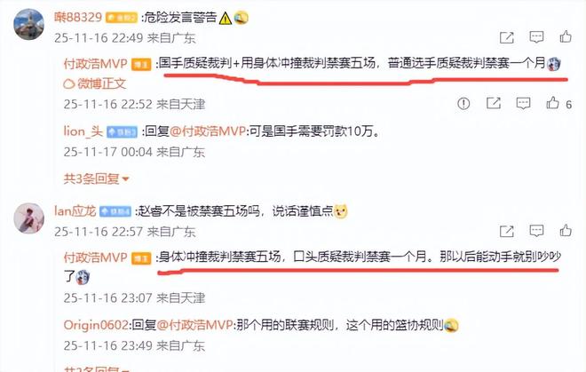 這份重磅罰單也引起熱議,有人認為對不尊重裁判的行為就該嚴懲。但也有人認為處罰重了。知名媒體人付政浩就認為處罰過重了。他在與網友互動時說,“國手質疑裁判+用身體衝撞裁判禁賽五場,普通選手質疑裁判禁賽一個月。”顯然付政浩暗指的是趙睿,趙睿曾在新疆主場,嚴重質疑裁判吹判,並用身體衝撞裁判,才禁賽五場。付政浩指出,“身體衝撞裁判禁賽五場,口頭質疑裁判禁賽一個月。那以後能動手就別吵吵了”顯然付政浩有些嘲諷的口忽,意思是與趙睿的處罰相比有過分了。