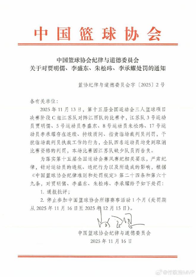 昨晚9點罰單來了,中國籃協公布重磅罰單。除了對賈明儒、李盛東、朱鬆瑋、李承耀給予通報外,還停止他們參加中國籃球協會所轄賽事活動1個月(處罰期從2025年11月16日至2025年12月15日)。看來這四人已經鐵定缺席2026俱樂部杯12月份的比賽,聯賽第一輪的比賽也打不了。