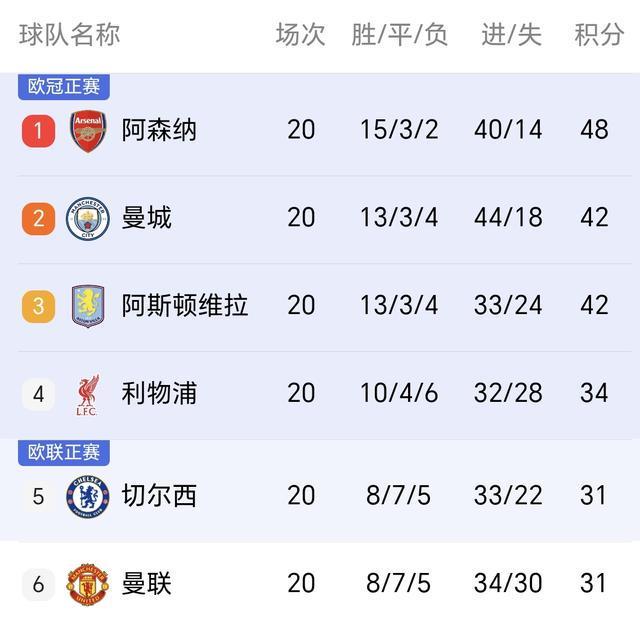 曼城連續兩輪丟分後,20輪積42分位列英超第2,與20輪積48分高居榜首的阿森納已相差6分。
