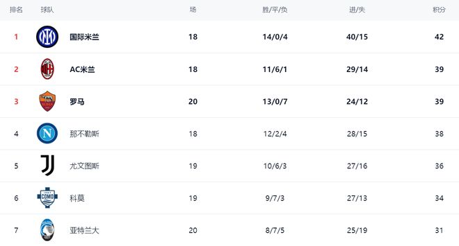 在積分榜上,國際米蘭以42分排名榜首。AC米蘭39分排名第2。羅馬贏球之後,總積分也是39分,升到第3名。不過,羅馬比AC米蘭多踢了2場比賽,要想進一步提升排名並不簡單。那不勒斯38分排名第4。第5的是尤文圖斯,拿到了36分。科莫隻收獲平局,總積分是34分,排名第6。亞特蘭大排名不斷上升,總積分現在達到31分,排名第7。
