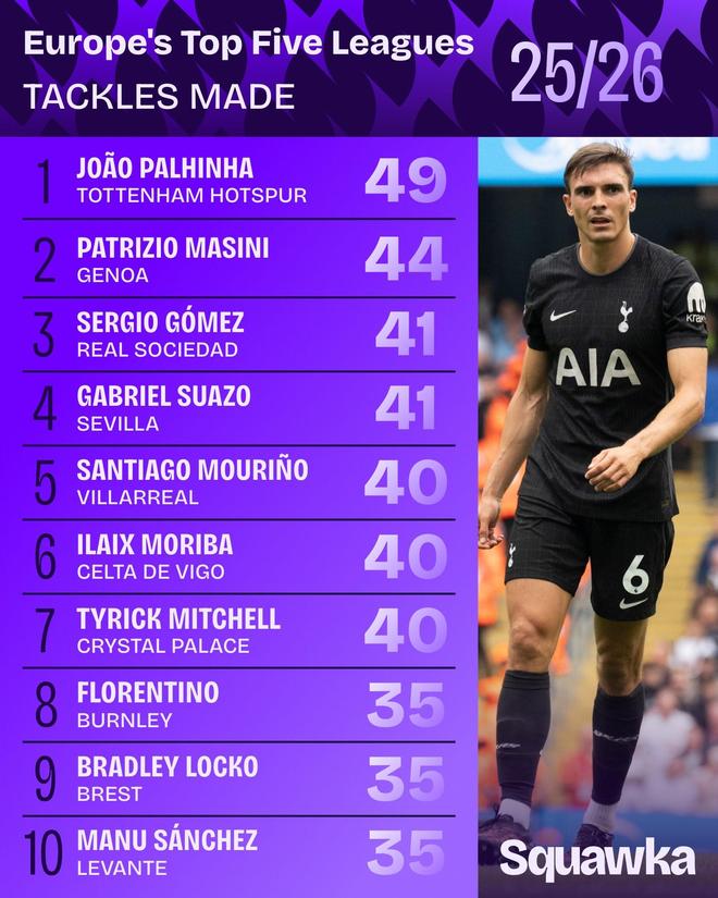 北京時間11月21日,知名數據機構Squawka統計出了2025-26賽季歐洲五大聯賽的球員搶斷榜,托特納姆熱刺的中場球星帕利尼亞以49次排名榜首。